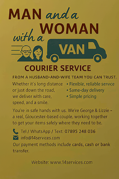 We’re George and Lizzie — a husband-and-wife team with hands-on experience and a genuine passion for dependable delivery. At 14 SERVICES, we treat every job with care, drawing on years of work with major gig economy courier platforms as well as independent work to offer trusted, flexible transport solutions.